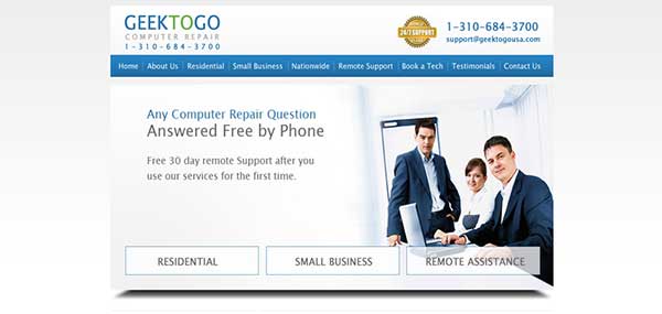 GeektoGo — Here’s a website that’s playing the professional angle a little harder than our last example, but it’s still done using the same style. Nice clean white background with pictures that clue you in instantly, and one easy click to whichever type of service you were looking for when you dropped by. You’ll notice the copy is neat and minimal. It’s available if visitors want questions quickly answered, but also completely out of their way if they’re looking to call as soon as possible.
