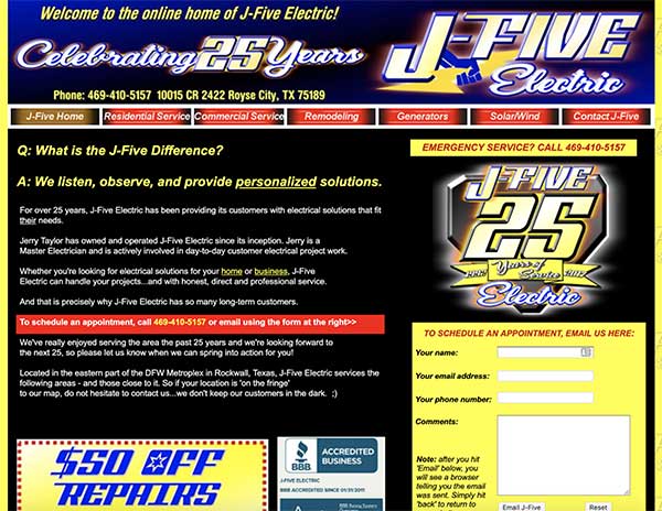 J-Five Electric out of Dallas gets many of the same things right as Trademark Electric, but this website uses a very different philosophy when it comes to content. Each service area is simple to find, but at the same time, tons of information can be found on the main page. This isn’t a problem because the information is well-labelled and broken up, so customers can still move through it quickly without wasting time on anything they don’t need to know. Now that you understand how either model of content can work, you’ll have an easier time implementing it on your own electrician website.