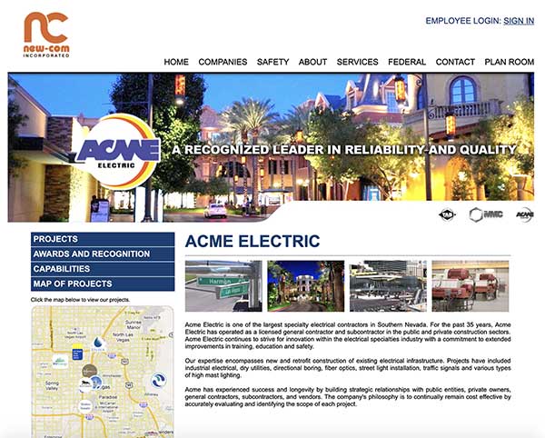 New-Com Inc out of Los Vegas is another just-the-basics site that looks great. This website is very image-dominated, which is always a good strategy when it comes to modern audiences. The colors used here—yellow and blue—are one of the most popular color combinations for movie posters because of how effectively they draw attention when used together. All the websites we’ve looked at so far have had great pictures, but none has so well made every image consistent with the overall design.