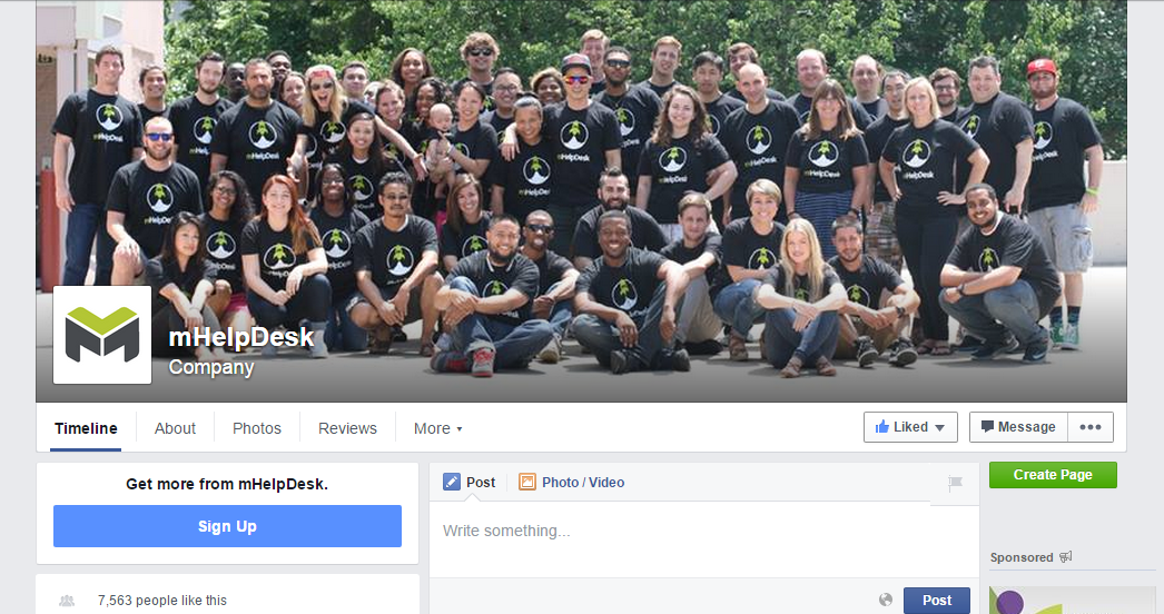 While the profile picture will appear several places on Facebook to identify your business and your page, the cover photo only appears on your page, at the top, and serves as an anchor. The cover photo is very important because it is large and the main brand impression for customers and prospective customers visiting your page. There are many different types of images to consider using here, including a photo of techs in the field or a landscape view of your equipment. Here at mHelpDesk, we’ve chosen to highlight our team in our cover photo:
