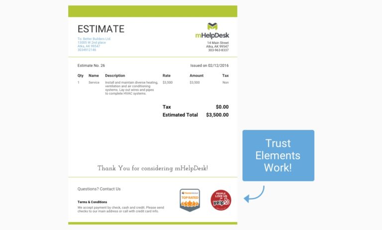 Your estimates need to sell your business by answering these types of questions. They need to tell the homeowner that you’re the best pro for the job and you can be trusted. This can easily be accomplished by adding what we call “trust elements”, which include badges from review sites like HomeAdvisor or Yelp.