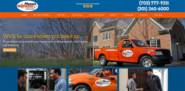The Mannix Heating & Cooling website is striking. There is obvious great use of images and a strong color design that perfectly matches it. However, we do see some very different color choices here. The vibrant look achieved by Mannix is very different from the palette used by most HVAC websites, but you’ll probably agree that it still comes across as professional and trustworthy.
