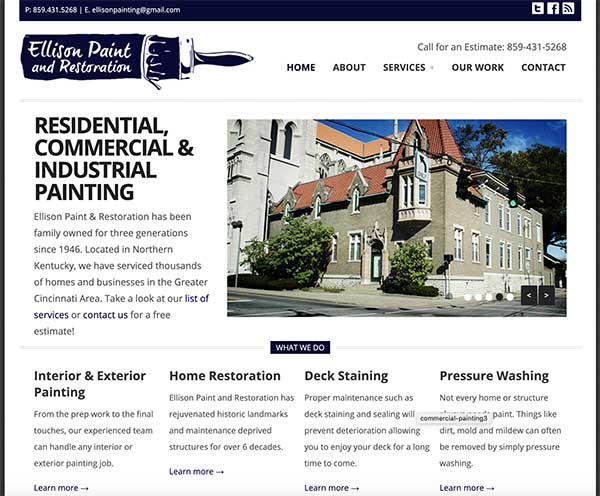 Ellison Paint and Restoration — The word for this website is “classy.” They’ve got a nice, custom-designed logo and have matched their header to it nicely. They’ve gone to the trouble of uploading a favicon that matches. The photographs demonstrate their taste for fine architecture and historic buildings; you know they’ll be able to handle your suburban split-level mock Tudor. All the photos reinforce that aesthetic. None of the buildings clashes with the others. The text information is displayed in easy-to-scan fashion and the gallery is a nice teaser below, encouraging readers to click on the photos and engage with the site. The all-important phone number remains in the header, no matter which page you’re on.