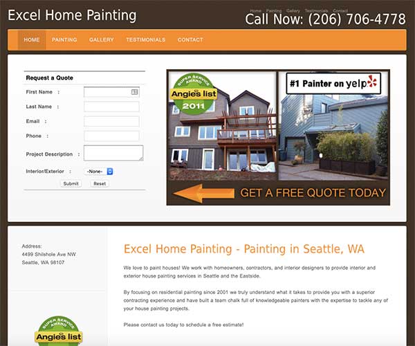 Excel Home Painting — The thing we love about this one is that the call to action, ie Hire Us, is right there at the top of every page in the form of a whole contact form. The site is clean, bright, and modern, and the focus of every single page is that form to fill out and get a free quote. Make it as easy for your customers to get ahold of you.