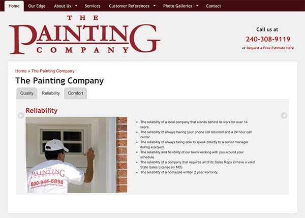 The Painting Company — Somebody’s web designer really went to town with the reds here. The site conveys a strong, bold impression that also manages to convey sophistication in the way it’s used. The color is used in elements all around the website, from the header to the widgets to sub-headers and artistic flourishes around the site. If you have a trademark color, and a painter should think about it, don’t be shy about making it the trademark of your site as well.