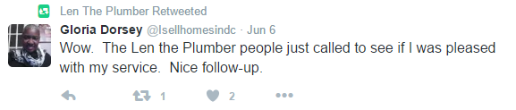 Len the Plumber, who services the Washington D.C. metro area, is great at following Twitter for shout-outs from his customers, in addition to people who comment on his commercials.