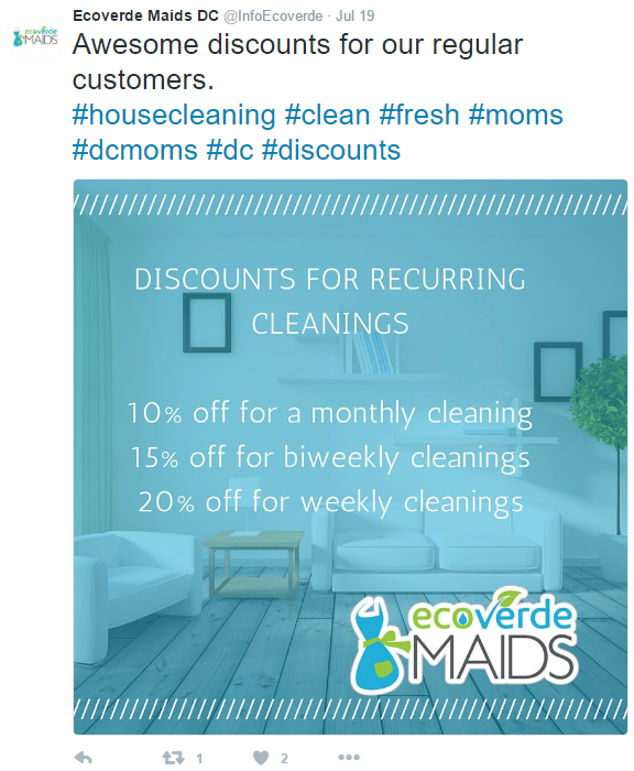 Your followers on social media are already engaged customers. Offering sweepstakes, discounts or coupons will encourage them to keep an eye out for your page. Promotions are also a great way to get new leads and social media followers. If you run a great contest or discount, many of your followers will likely tag their family and friends in the post. Some businesses also consider fan-only incentives as a way to reward their loyal customers:Ecoverde Maids, a cleaning services company from Washington D.C., frequently runs discounts for their repeat customers. They also take advantage of “Refer and Friend” promotions to get new leads.