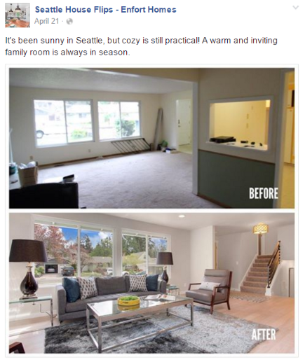 Social media is the easiest way to promote and show off your work, so you should absolutely be using your social channels to do so. One of the highest converting images on social media are comparison photos. Think about how many transformation or before and after photos you’ve liked — people love to see results! What’s great is these photos can work across many types of field service businesses. Take a page out of this business’ book:Enfort Homes, who builds and renovates high-end homes in the Greater Seattle area, regularly shares its home transformations on Facebook and Twitter and gets plenty of engagement from their followers.