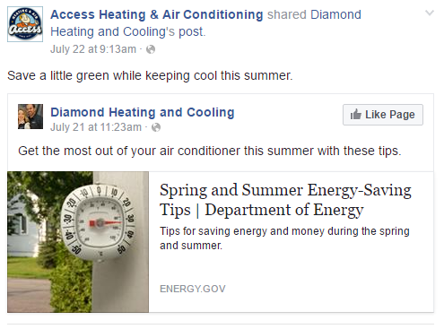 Posting valuable content is key on social media, so make sure that you’re sharing helpful ideas, news and advice around your industry or business. Your followers will appreciate the information and doing so will also help position you as an expert and keep you top of mind for the next time they need you (or when their family member or friend does). Remember the tips and things you share don’t all have to come from you. It’s as easy as sharing content from your favorite websites, blogs and social media accounts, like this business did:Access Heating & Hair Conditioning in Meridian, ID does a good job of sharing good information from trusted websites and sources.