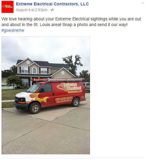 Social media is a great way to source information from your fans. You can simply ask a question to your followers in a Facebook update, or if you’re on Twitter, use polls, which are really easy to set up. A painting business could ask their followers for their opinion on the latest color or home trends. An HVAC business could survey their users on the best temperature to sleep at night. Some field service businesses take it a step further and ask their followers for help, like getting their vote in a local contest or an online round-up. If you’ve given superior service, chances are your customers would be more than happy to take a second to that. We also like this example:Extreme Electrical Contractors, located in St. Louis, has had success in asking customers to share photos of their truck on social media. It’s a clever way to get their fans involved and to get their brand out in their area.