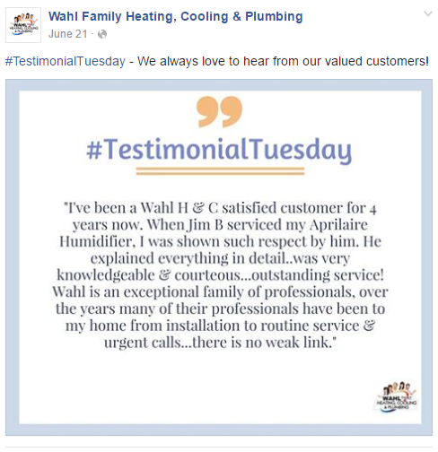 Did you get a stellar review on Yelp, Facebook or Home Advisor? Reviews are one of the easiest things you can promote on your social media pages. They also give you another opportunity to show appreciation to your customers. Take this example:Wahl Family Heating, Cooling & Plumbing in Carnegie, PA has a great social media feature called “#Testimonial Tuesdays” to share their customers’ feedback.